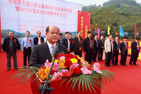 為貫徹落實(shí)自治區(qū)黨委、政府在全區(qū)掀起項(xiàng)目建設(shè)新高潮的決策部署,沖刺第四季度,完成全年公路建設(shè)目標(biāo)任務(wù),自治區(qū)交通運(yùn)輸廳于11月3日舉行全區(qū)公路路網(wǎng)改造項(xiàng)目集中開工儀式。由集團(tuán)公司承辦的分會(huì)場——那坡至平孟口岸公路等16個(gè)公路路網(wǎng)項(xiàng)目暨5670公里農(nóng)村公路集中開工儀式在百色市那坡縣德隆鄉(xiāng)隆重舉行。自治區(qū)交通運(yùn)輸廳紀(jì)檢組長、廳黨組成員朱名勝,百色市市委常委、政法委書記周武紅,市人大常委會(huì)黨組成員黃五同,集團(tuán)公司黨委書記、董事長朱堅(jiān)和、總經(jīng)理李定倫、黨委副書記張友坐、副總經(jīng)理劉明洪、總工程師覃炳賢,自治區(qū)公路管理局、百色市公路管理局、交通運(yùn)輸局、那坡縣四家班子、集團(tuán)公司直屬各單位領(lǐng)導(dǎo)及有關(guān)部門負(fù)責(zé)人等出席開工儀式。