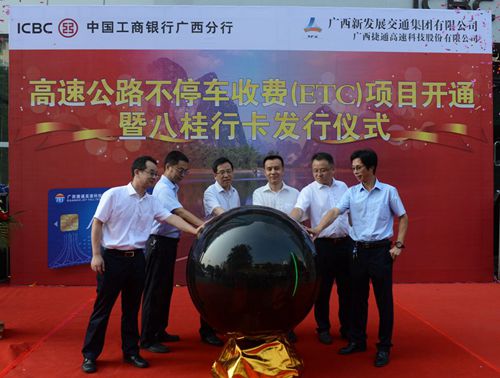 劉明洪在致辭中表示,早在今年3月份,工行就成為廣西首批入圍ETC項(xiàng)目的合作銀行,雙方成功簽署了ETC項(xiàng)目合作協(xié)議,并取得了豐碩的合作成果,此次儀式正式啟動(dòng),標(biāo)志著雙方合作邁上一個(gè)全新的高度。集團(tuán)公司將不斷推進(jìn)ETC業(yè)務(wù)市場拓展,未來ETC將不只限于高速公路收費(fèi),還會不斷向加油站、停車場、城市小區(qū)、普通公路等相關(guān)領(lǐng)域延伸。