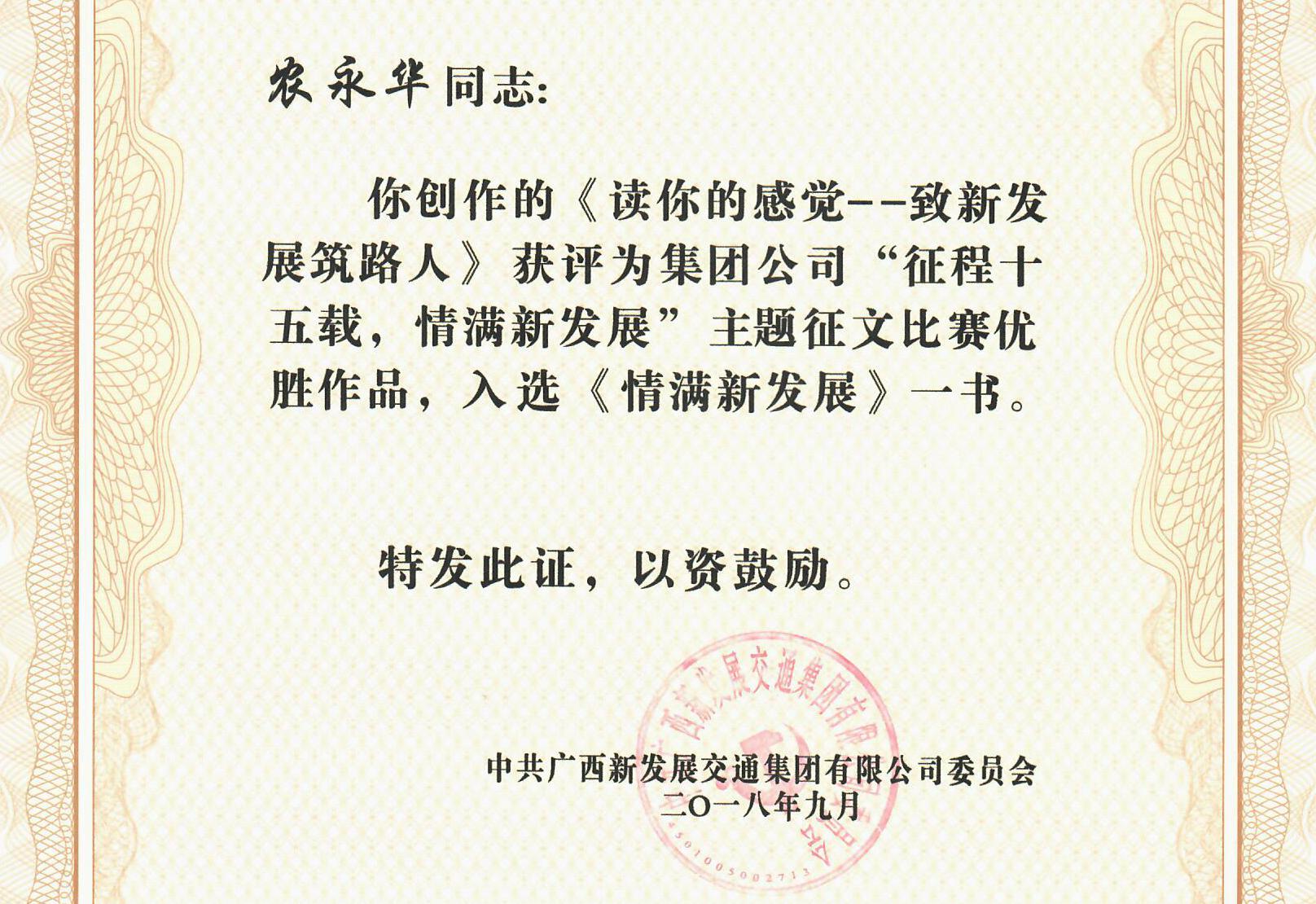 近日,廣西新發(fā)展交通集團“征程十五載,情滿新發(fā)展”主題征文比賽進入到了評比表彰階段,共有104篇征文被評為優(yōu)勝作品,入選《情滿新發(fā)展》一書。