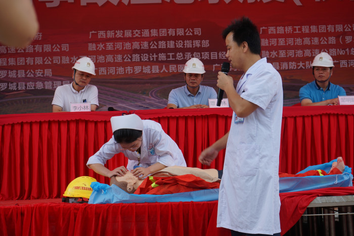 當(dāng)天的演練現(xiàn)場模擬情景為:2019年6月20日,在羅城縣四把鎮(zhèn)沖灣屯附近,融河高速公路K54+100高邊坡處現(xiàn)場4名邊坡防護(hù)作業(yè)人員正在緊張的施工,由于連續(xù)雨天上邊坡坡頂土體部分突然滑落,繼而出現(xiàn)大的滑坡裂縫,隨之大面積土石體坍塌,1名施工人員被垮塌的土石壓埋。事故發(fā)生后,參與演練人員及時(shí)報(bào)告和啟動應(yīng)急預(yù)案,在坍塌現(xiàn)場設(shè)置臨時(shí)指揮部,指揮現(xiàn)場救援,將傷者抬出被困位置后,在演練會場進(jìn)行現(xiàn)場醫(yī)療和急救演示,再由救護(hù)車送到羅城縣人民醫(yī)院進(jìn)一步治療。